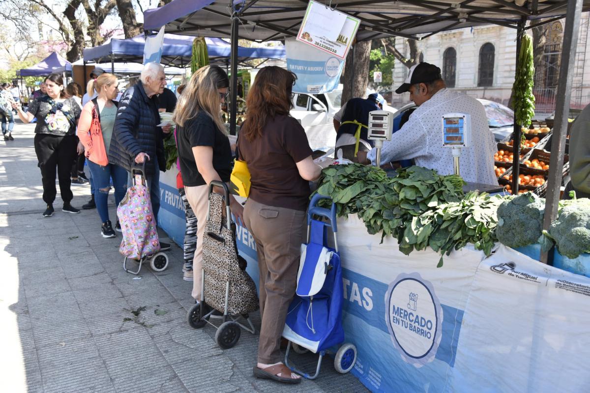 En los puestos del programa El Mercado en tu Barrio, impulsado por la Dirección de Relaciones Institucionales de la Municipalidad de San Miguel de Tucumán para colaborar con la economía familiar, los vecinos pueden conseguir ofertas en frutas, verduras, condimentos, huevos, productos de limpieza, y útiles escolares, entre otros alimentos e insumos para el hogar, en distintos espacios públicos de la ciudad.