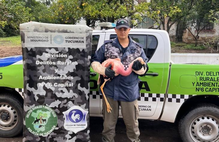 Efectivos pertenecientes a la División Delitos Rurales y Ambientales Capital rescataron al ejemplar conocido también como Phoenicopterus