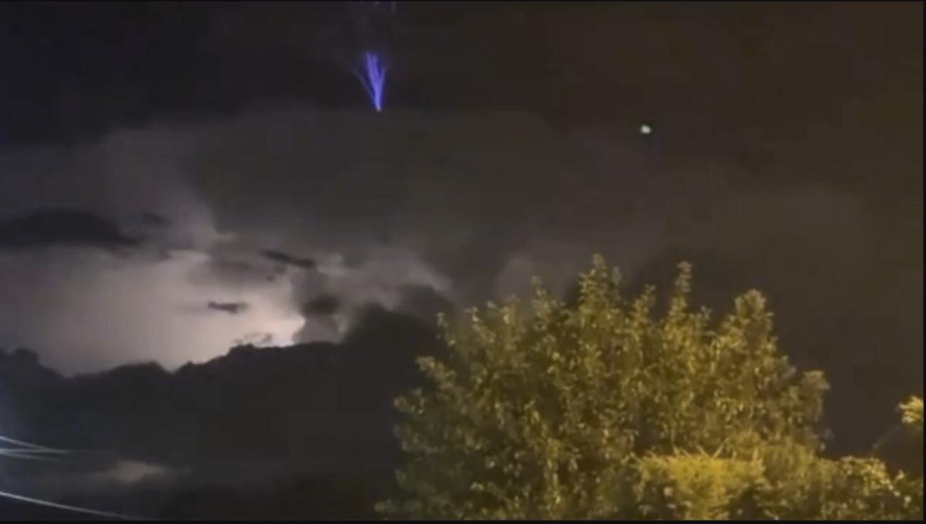 Una intensa descarga eléctrica ascendente de color azul atravesó el cielo en medio de una tormenta severa