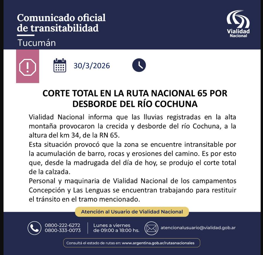 El corte total de la ruta nacional 65 en el sur de Tucumán se mantiene como una medida preventiva clave tras la fuerte crecida del río Medina, que provocó importantes daños en la calzada a la altura de Aguilares.