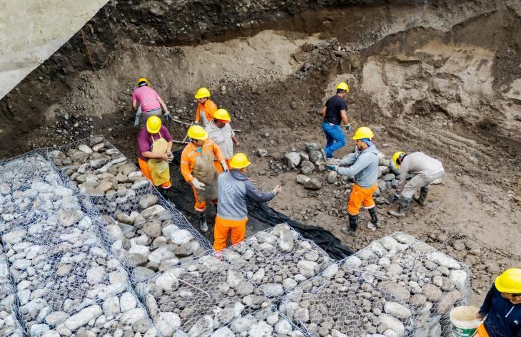 El plan de obra contempla una solución técnica robusta mediante la instalación de muros de defensa con gaviones y colchonetas, además de la ejecución de espigones en la margen este para prevenir futuros desbordes. Paralelamente se realiza un trabajo de rectificación y encauce del río, tanto aguas arriba como aguas abajo del puente, para optimizar el escurrimiento y evitar anegamientos.